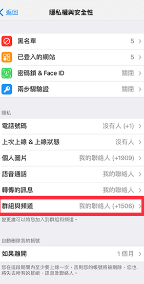 2、该选项专门用于管理与群组和频道相关的隐私设置,是本次操作的关键设置入口。