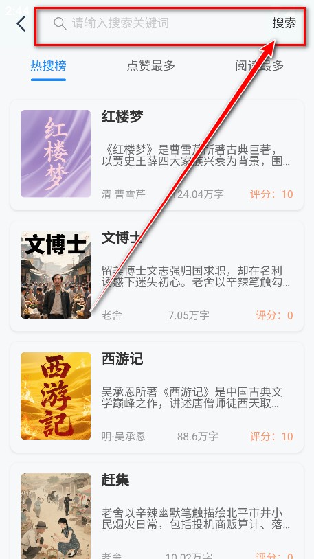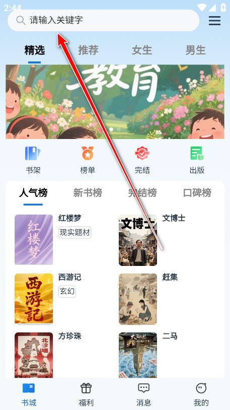 1.下载安装并打开辰思小说,点击上方的搜索框。