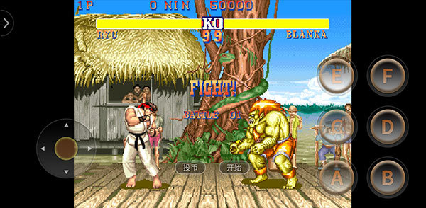 1、打开街头霸王2,先点击“投币”,再点击“开始”。