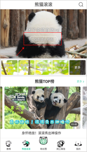 1、进到app中,点击“熊猫滚滚频道”,点击上方的“点击进入观看”就能看到我们的小熊猫啦,咱就是说谁能拒绝这么可爱的小熊猫呢?