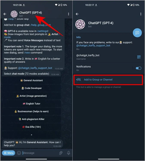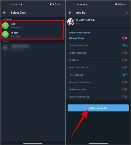 3、在下一页上,选择要将机器人添加到的组或频道。如果您找不到要添加 ChatGPT 机器人的群组或频道,则表示您不是所有者,不允许将人员或机器人添加到该群组或频道中。请先联系群组或频道的管理员。
