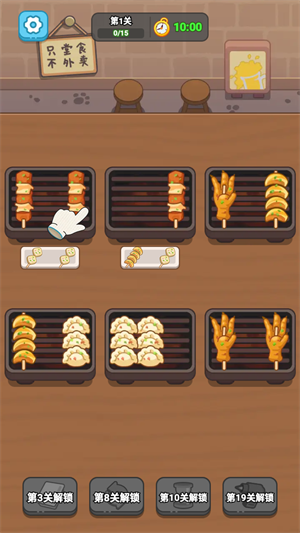 2、玩家只需要将三个相同的串串放在一个烤肉盘中即可完成消除。