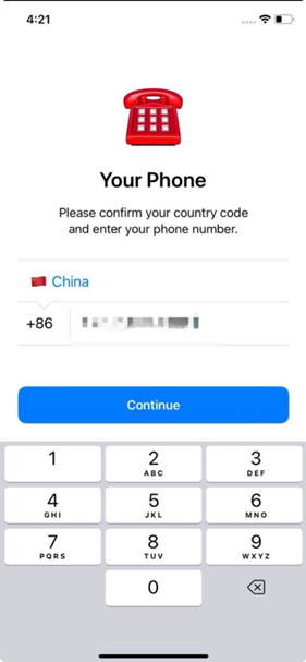 2、地区选择 China,输入telegraph账户关联的+86手机号码,然后点击“Continue”
