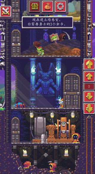 3、玩家需求不断修建一座高塔来对抗勇者,而且是向上与向下延伸,每一层都有固定的功能