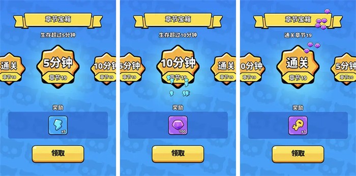 记得每次通关都领取下,有一把宝箱钥匙,分别为5分钟奖励、10分钟奖励和15分钟奖励。
