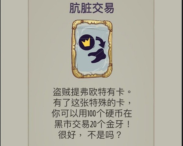 选盗贼提弗欧,带上肮脏交易,用主动技能配合增值4/卡牌换符文2/身强力壮1刷金币+符文,前期翻遍房间每个区块(收集金币配合增值),理论上资源够每轮过一遍手牌(包括负面卡牌,前提是手牌不卡发动条件),意味着每个房间都能进帐20金牙,总共50个房间:20*50=1000(还不算守卫掉落)。