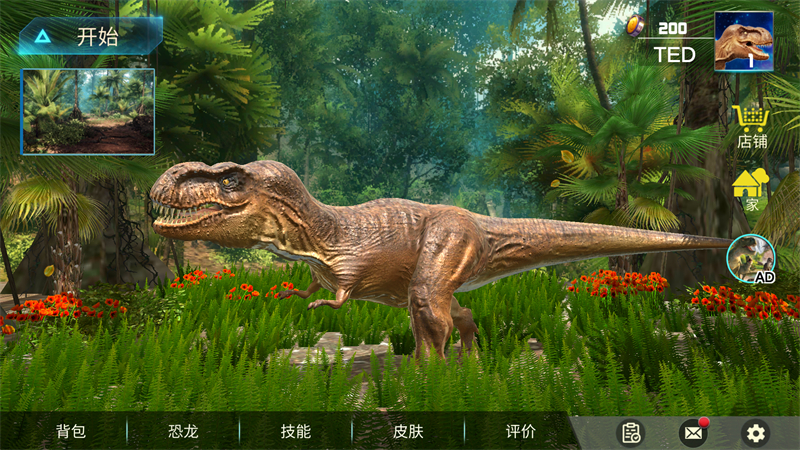 2、接下来我们可以正式进入到游戏里,然后可以选择背包、恐龙、技能、皮肤等多个选项进行查看。