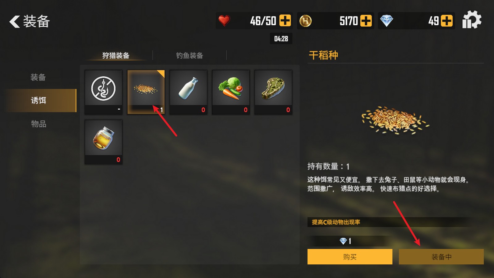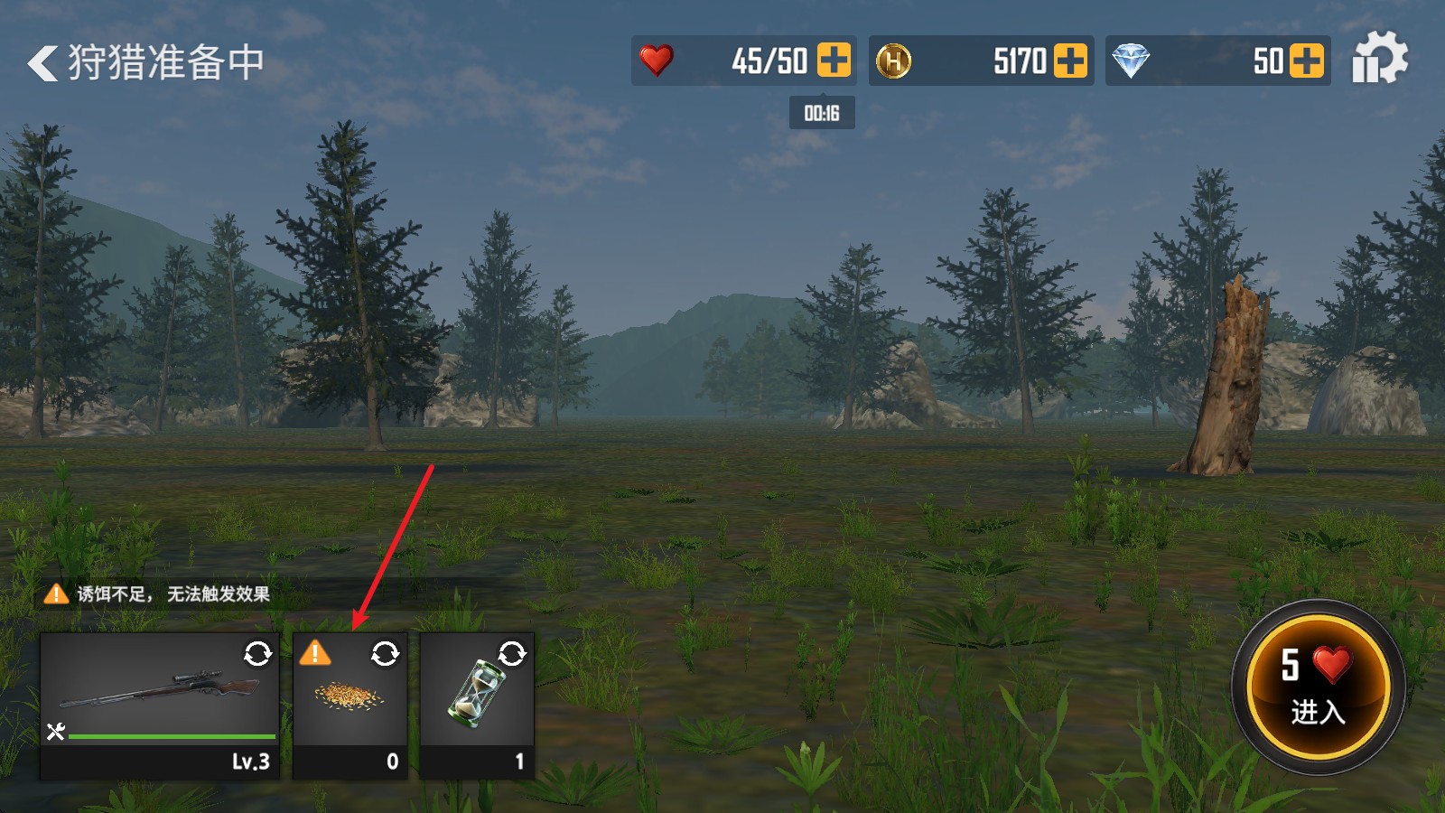 1、进入游戏后,选择区域即可开始狩猎,狩猎前我们需要准备一些诱饵。