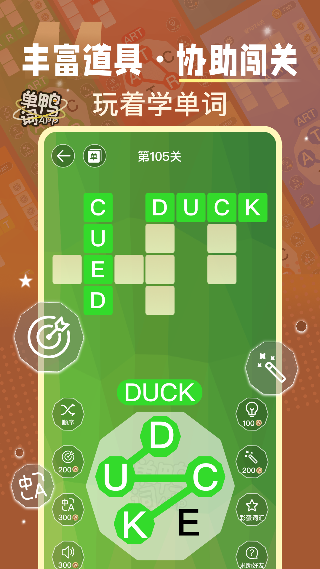1、单词消消乐:滑动轮盘拼单词,类似消消乐操作,如连接字母“d-u-c-k”消除单词,闯关过程中自动记录生词。