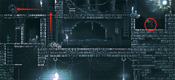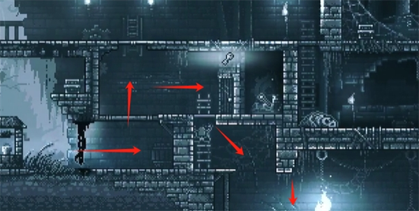 12、爬上吊灯右边的平台,柱子会断裂,把之前推断的柱子推过来修复平台,从平台往左跳过去,获得钥匙。
