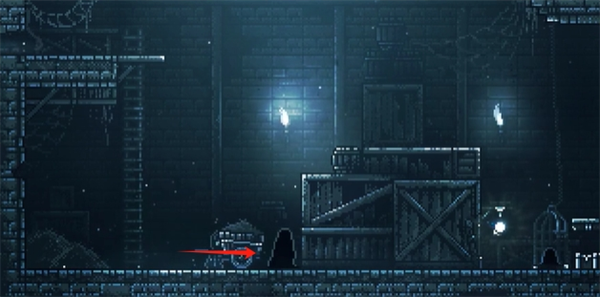 5、把推车推到梯子和黑色怪物中间的地方,然后爬上梯子,跳起来勾引黑色怪物。黑色怪物跳下来后,把推车推过去压死怪物。之后继续往右,进入关着黑色怪物的笼子左边。