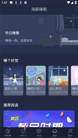 2、睡更好页可查看昨日睡情,设有放松小课、睡吧计划等实用功能,还有推荐阅读板块,多维度帮助用户提升睡眠质量。