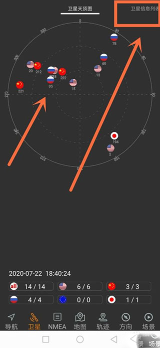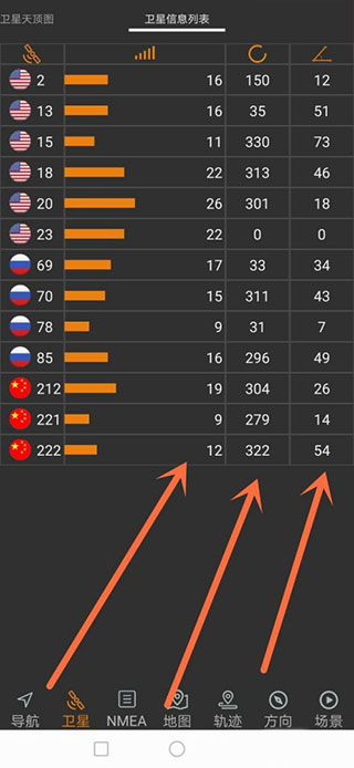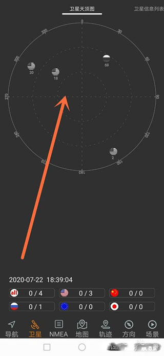 2、在主界面底部点击【卫星】按钮,进入卫星状态查看界面。