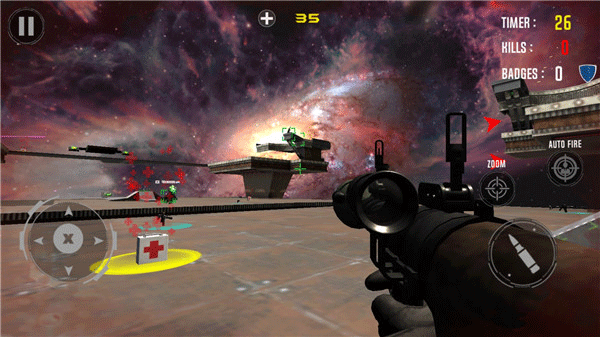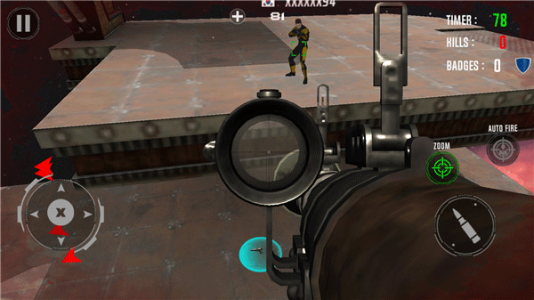 2、游戏的操作性比较强,在规定的时间内消灭的坏人越多得到的金币就会越多,而且还会有排名,3D空间感增加了游戏的难度,根据红色箭头来判断敌人所在的位置,然后迅速瞄准敌人,可以自动射击,也可以手动射击;