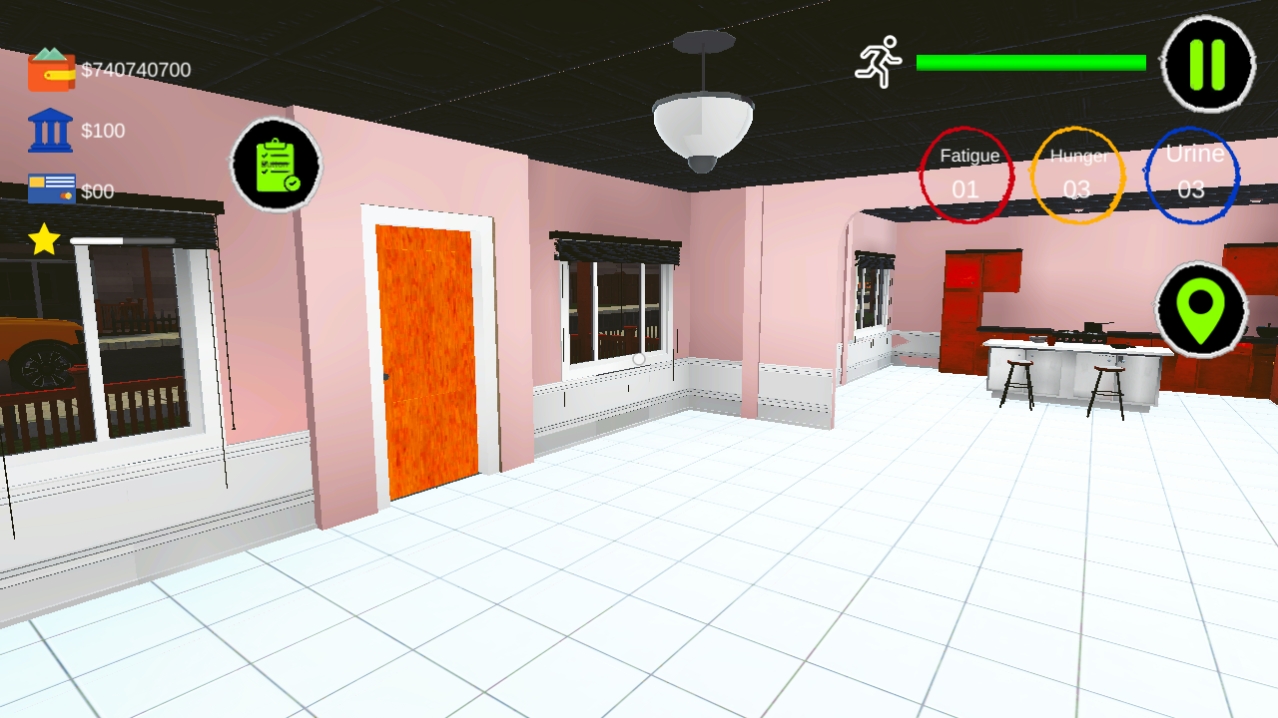 2、进入以后,玩家会出现在自己的家中,右上角的三个圆圈分别是疲劳、饥饿以及肮脏,代表着现在的状态,玩家需要及时关注;