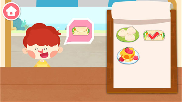 欢迎光临宝宝早餐车!顾客们都饿了么?快来点餐吧。你可以挑选主食,也可以挑选小吃,再点杯健康饮品,科学搭配早餐,营养摄入会更加均衡。顾客点好餐啦,宝宝快去厨房烹饪美味吧!