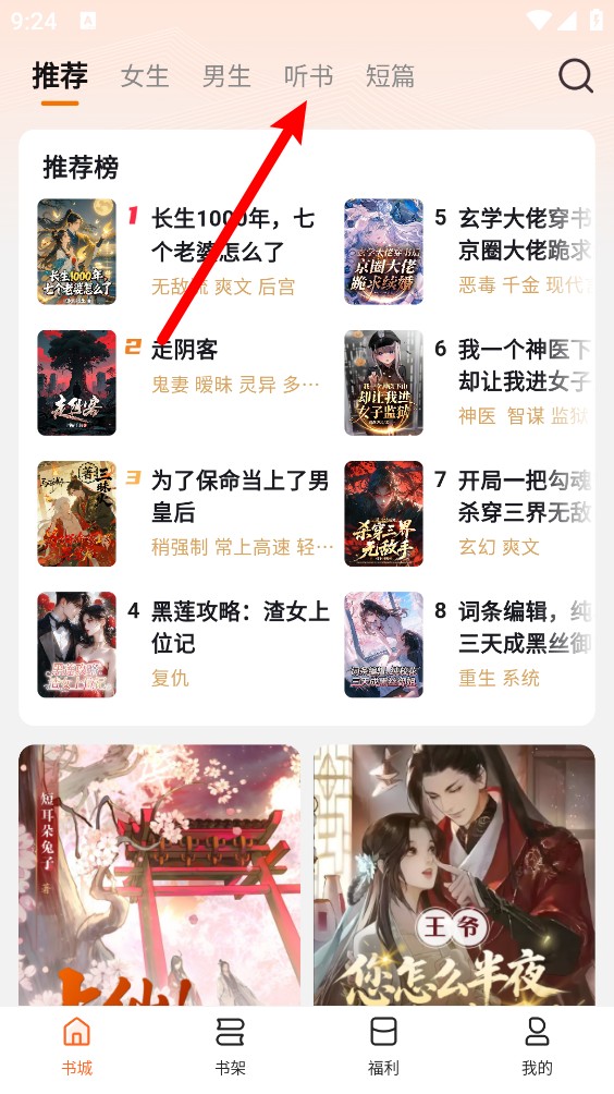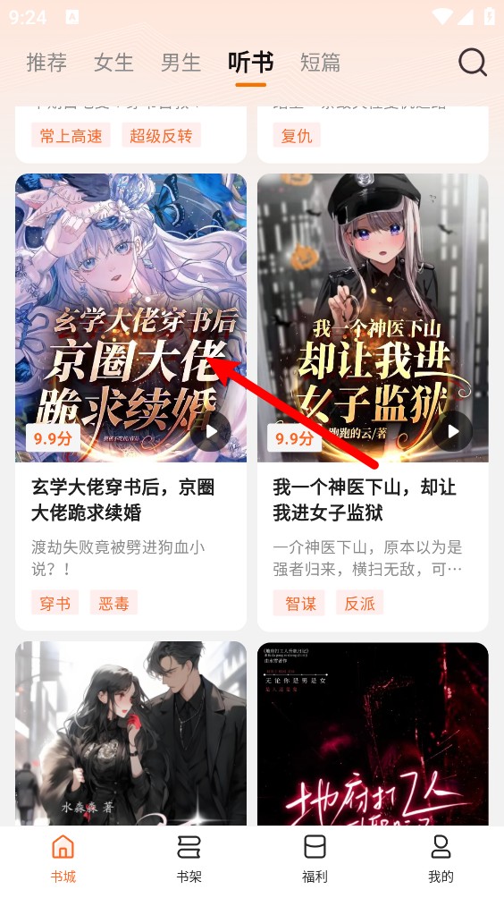 2、进入书城页面,点击""听书