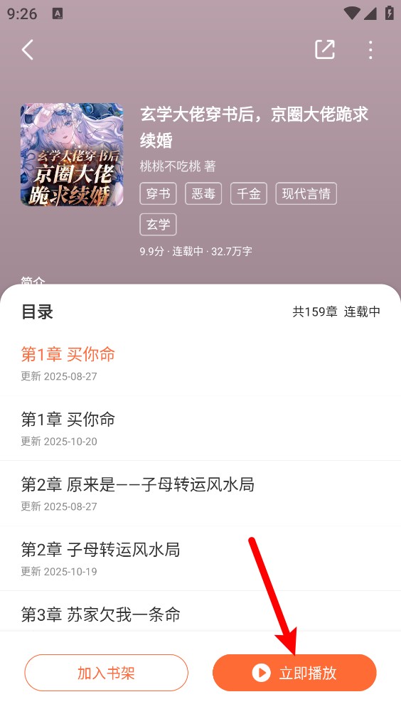 4、在小说详情页点击"立即播放"按钮