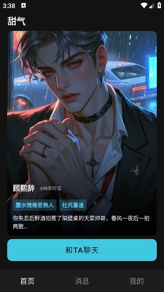 软件界面分为“首页、消息、我的”三大核心板块,首页展示角色列表与互动入口