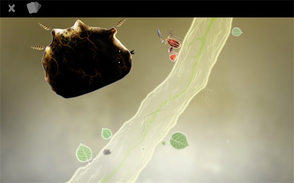 回到分叉口,再往最右端推进,会遇见两个晃动触角的守卫。此时唤出树枝形态的伙伴,让他倒挂垂落,悄无声息地绕过视线,勾走最后一根羽毛。