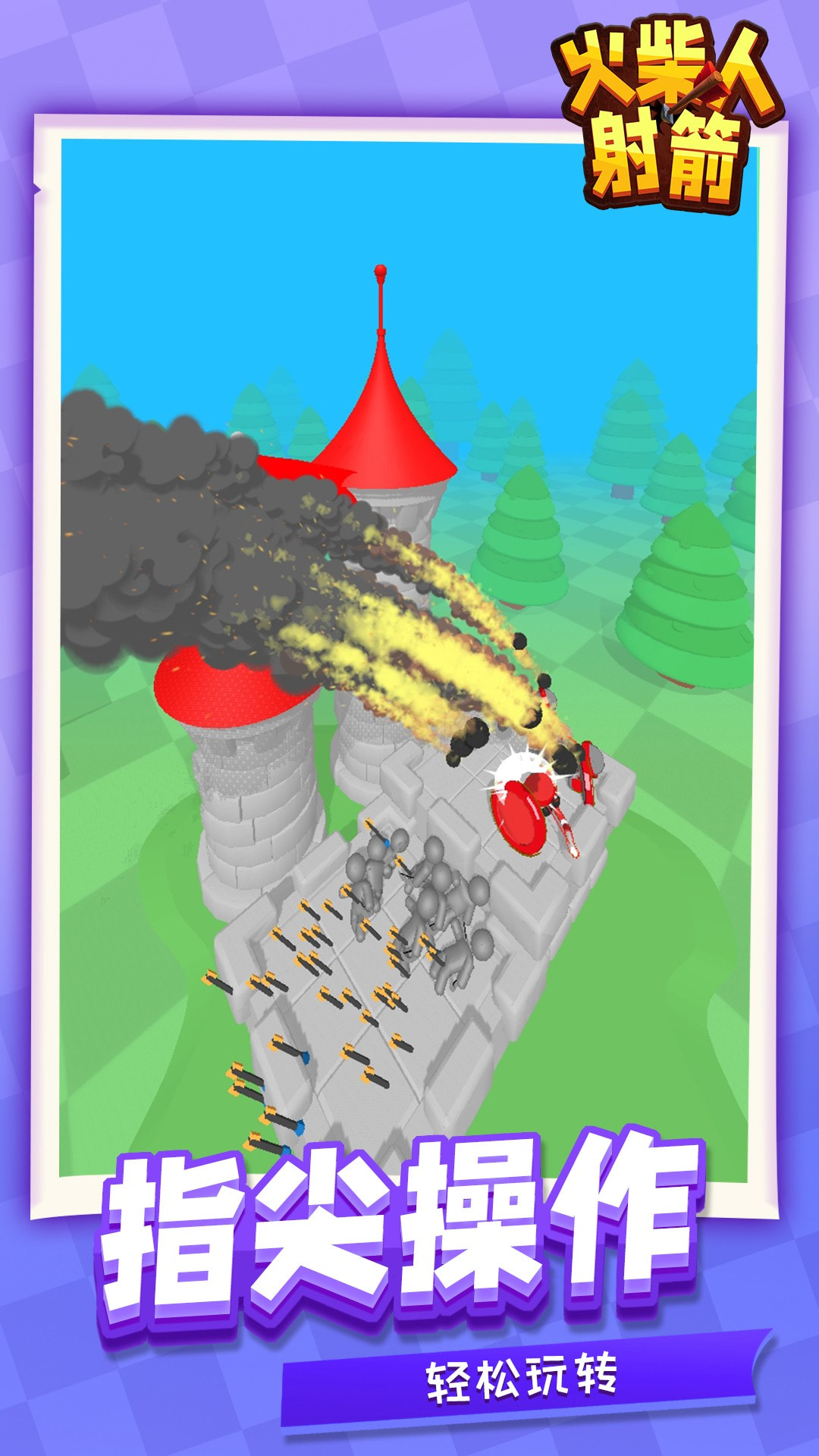 玩家化身火柴人指挥官,在城堡高台上部署弓箭手,拉弓瞄准、蓄力发射,精准打击敌方阵营。