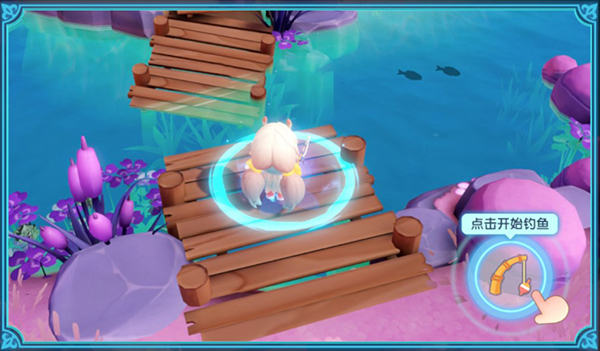 靠近水域时留意水下晃动的鱼影,出现闪亮钓点图标即可点击右侧鱼竿启动垂钓。