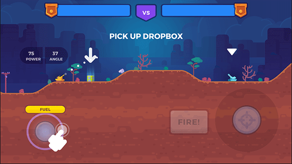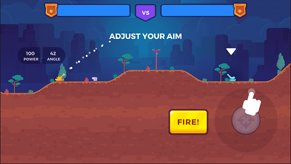 右手区域拖动瞄准线调节发射角度与力度,结合地形起伏与风力指示条预判弹道,确认无误后点击“FIRE”果断开火。