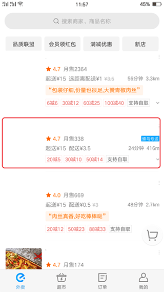 启动饿了么app,定位所在区域,挑选心仪商户并进入店铺;