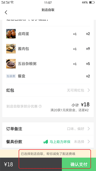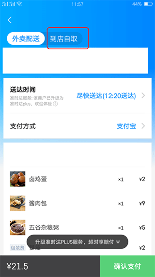 完成选餐后进入结算页,点击顶部“到店自取”选项切换取餐方式;