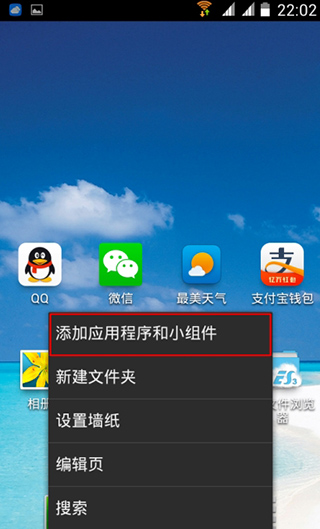 回到手机桌面,长按空白处或点击菜单键,选择添加小组件;