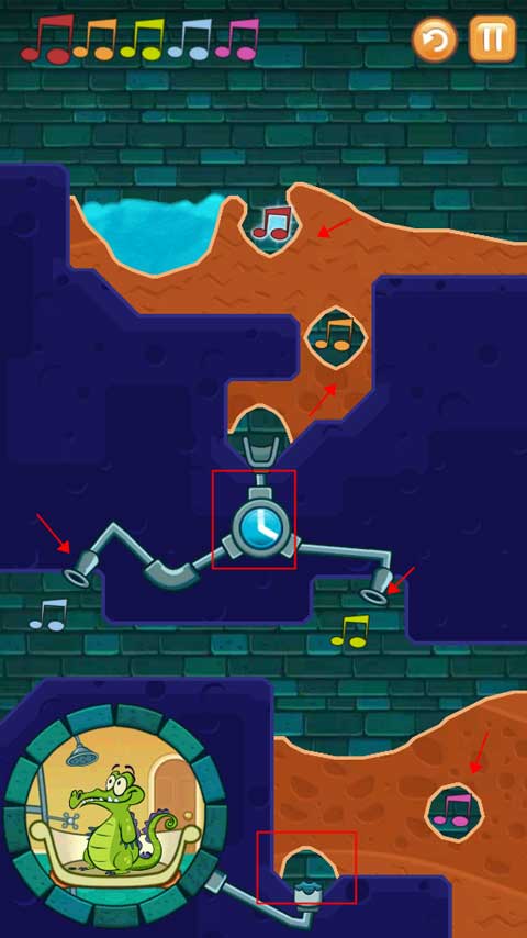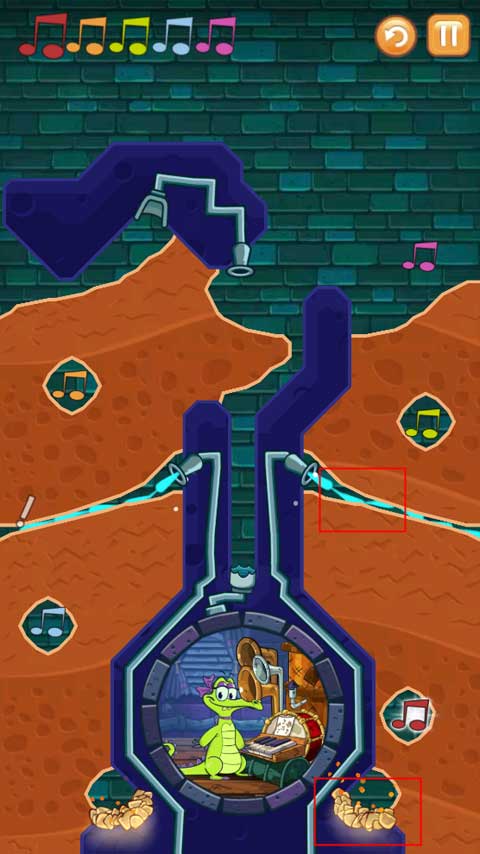 第一个挑战要求按照正确顺序将清水引导至所有音符位置,同时确保小鳄鱼能顺利洗澡。