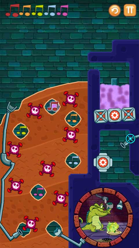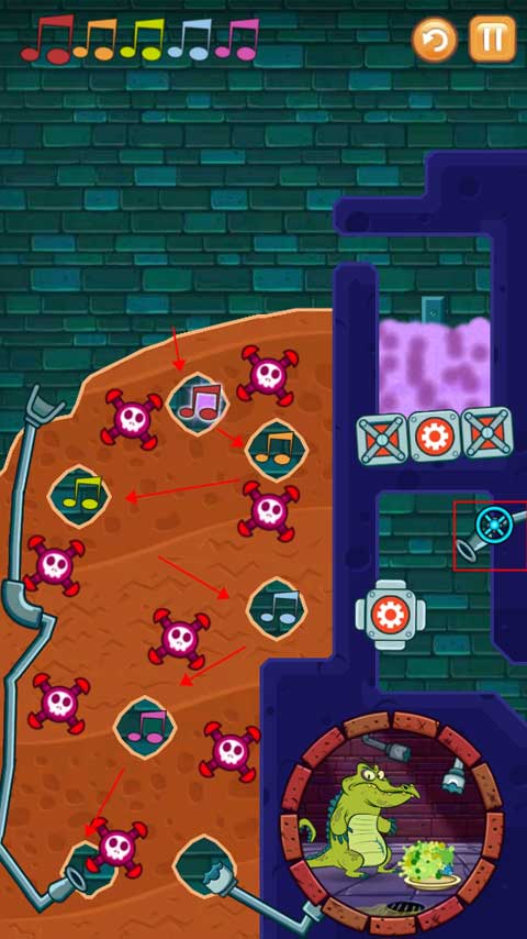 第二关需按顺序将受污染的水导入音符区域,过程中要避开炸弹爆炸风险,并保证小鳄鱼仍有干净水源可用。