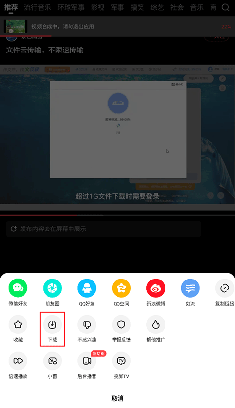 点击视频下方“分享”图标,在弹出菜单中选择“下载”即可保存至手机。
