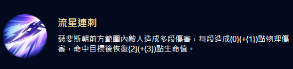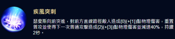 瑟斐斯向前方直线冲锋,对路径上的敌人造成190(+173)点物理伤害。