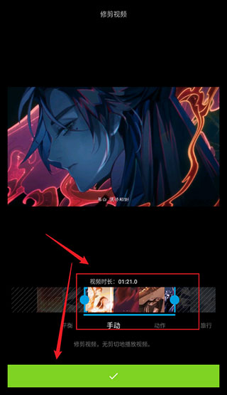 6. 拖动视频两侧滑块裁剪所需片段,完成后点击【勾】确认: