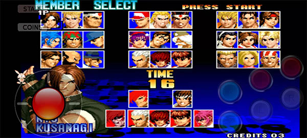 1. 完成拳皇97风云再起大蛇版下载安装后,点击“投币”并确认开始,选择你钟爱的格斗家登场。