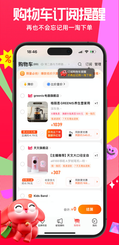 新增购物车补贴提醒,自动为你匹配专属优惠,通过一淘下单更省钱。