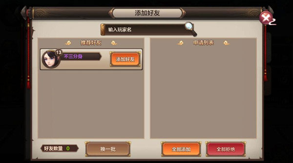 在好友界面点击“添加好友”,可选择系统推荐或手动输入玩家名称发起申请。