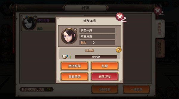 点击社交界面中的好友按钮进入好友列表,可进行私聊、互赠或领取耐力,亦可查看好友阵容、赠送鲜花或管理好友关系。好友度越高,每日可领取的耐力越多。