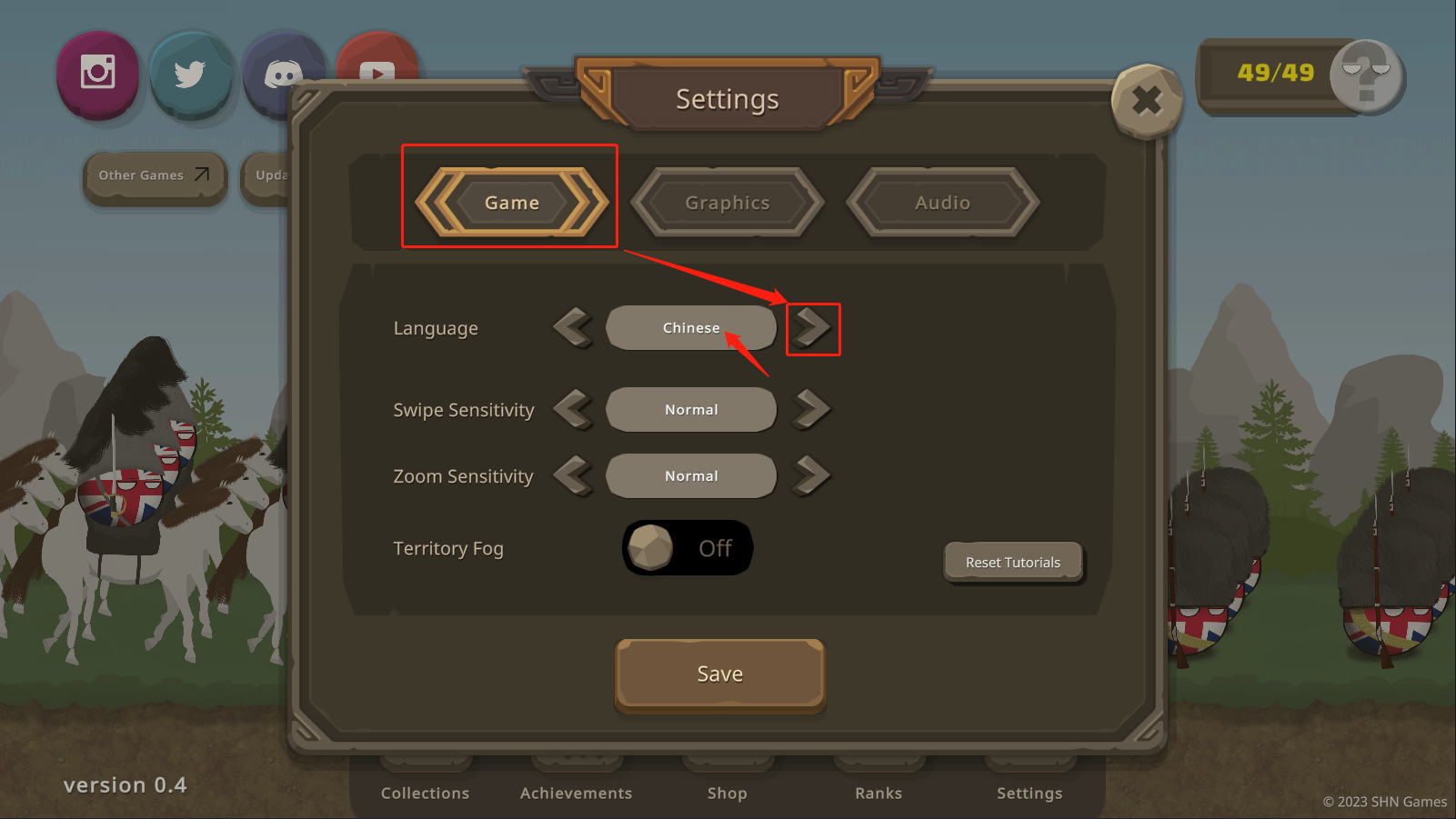 在设置页面中,先选择【Game】选项,随后连续点击【>】符号,直至出现“Chinese”字样,即表示已切换为中文语言,最后点击【save】保存设置即可。