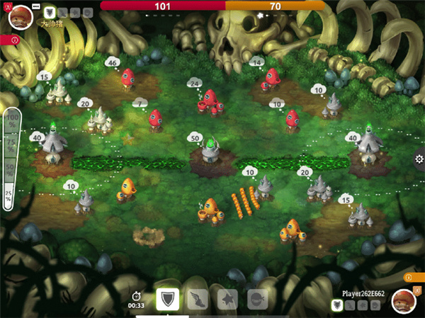 调兵遣将讲究效率。开局占据一处据点作为大本营,建筑会持续生产士兵,数量显示于上方气泡框。尽早夺取周边中立建筑,扩大兵力优势。出征时可通过左侧百分比滑块,灵活设定派出兵力比例(25%、50%、75%、100%),实现精准调度。