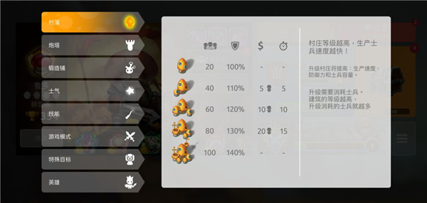 建筑升级是稳固战局的关键。村庄可消耗内部士兵进行升级,最多三级,分别消耗5、10、20单位兵力。升级后不仅提升防御力,还加快产兵速度并增加容量。