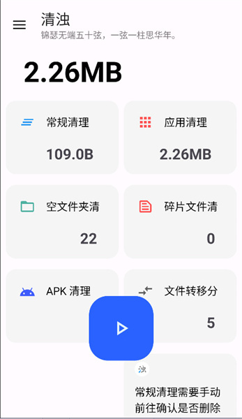 进入主界面后点击中央按钮即可启动垃圾扫描,扫描完毕再次点击蓝色按钮完成清理操作。
