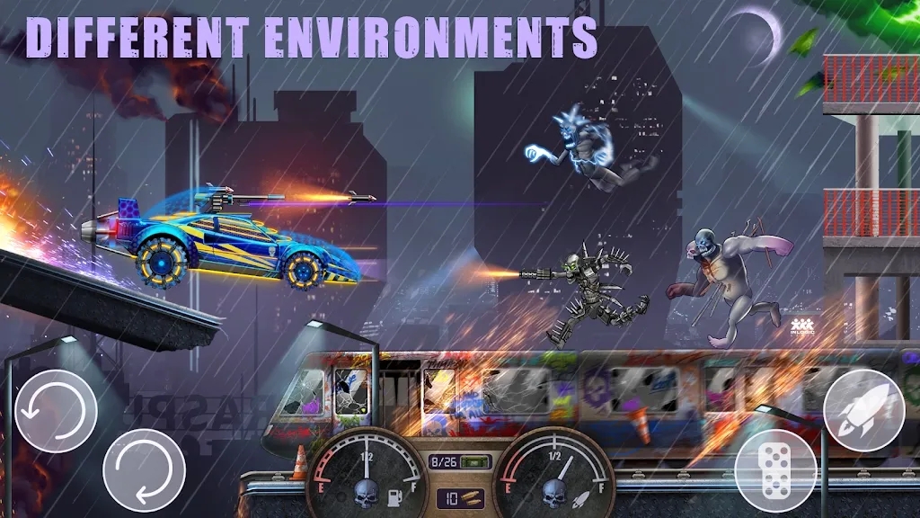 5、玩家需要保证赛车的平稳运行,同时利用地形巧妙地做出反应和攻击。你需要穿越不同的地形,应对邻近城市僵尸的破坏。